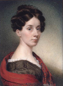 At a time when few American male artists achieved a high standard to match their European counterparts, Sarah Goodridge stood as one of the few women artists who rose to the heights of the profession. Born February 5, 1788, Goodridge painted her own self-portrait many times, including one in 1845 shown above. In that Self-Portrait, done in miniature in a tiny display case, as were most of her small, delicate, detailed works, Goodridge portrays herself working hard at her profession of painting, borrowing from the tradition of male painters who portrayed themselves proudly at work. Rather than looking confidently at the viewer, however, as most male artists did in their professional self-portraits, Goodridge lowers her eyes to the task at hand in a gesture that can be seen as one of feminine humility or, as I prefer to see it, one of concentration in the task at hand and a disdain for the recognition she knew was never coming as she neared the end of her life.